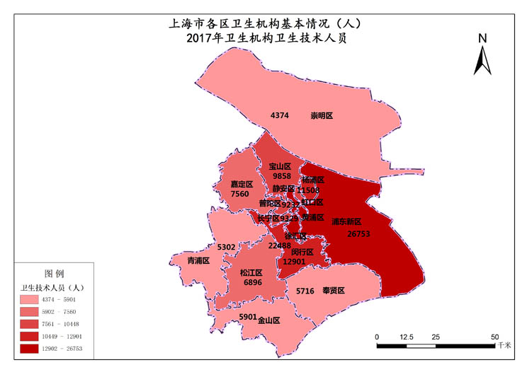 上海市2017年卫生机构卫生技术人员最高值是浦东新区,数值为26753人,最低值是崇明区,数值为4374人。各市的卫生机构卫生技术人员总和是187987人,各市平均值为11749人。