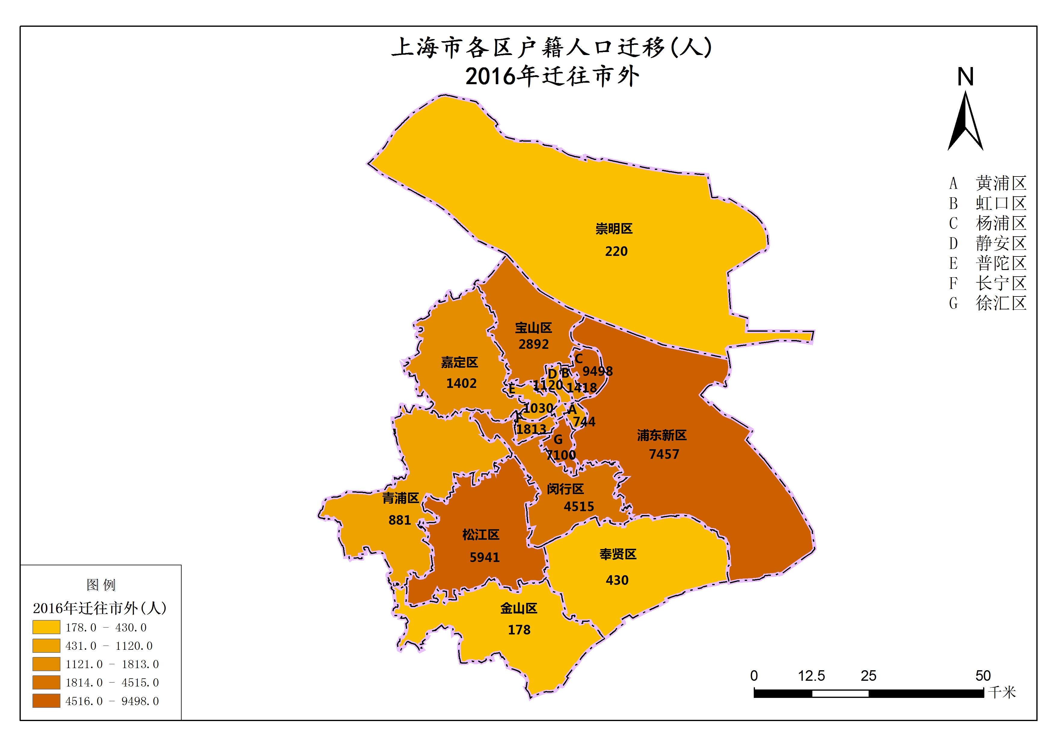 上海市2016年迁往市外最高值是杨浦区,数值为9498人,最低值是金山区,数值为178人。各市的迁往市外总和是46639人,各市平均值为2914人。