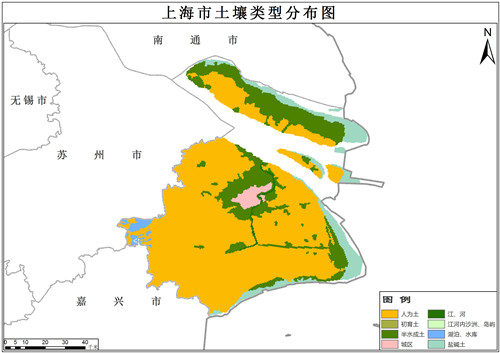 1995年上海市土壤类型分布数据采用传统的“土壤发生分类”系统,共分出12土纲,61个土类,227个亚类,基本制图单元为亚类,500米分辨率,通过三波段栅格数据进行组织,数学基础为2000国家大地坐标系(CGCS2000)及Albers投影。