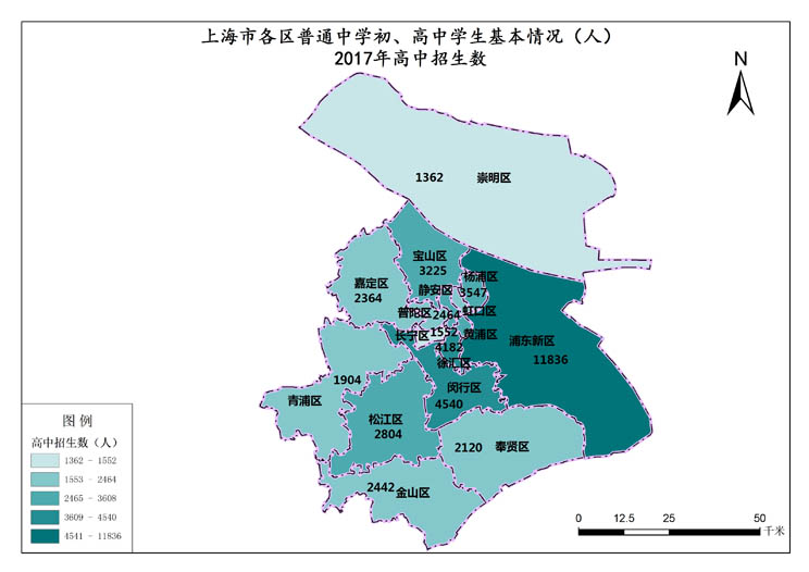 上海市2017年高中招生数最高值是浦东新区,数值为11836人,最低值是崇明区,数值为1362人。各市的高中招生数总和是53276人,各市平均值为3330人。