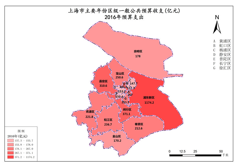 上海市2016年预算支出最高值是浦东新区,数值为1174.2亿元,最低值是虹口区,数值为137.27亿元。各市的预算支出总和是4538.71亿元,各市平均值为283.66亿元。